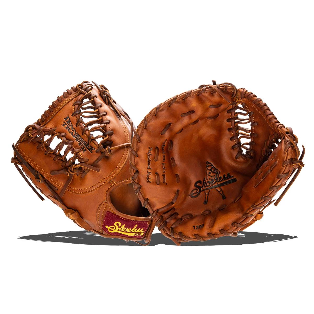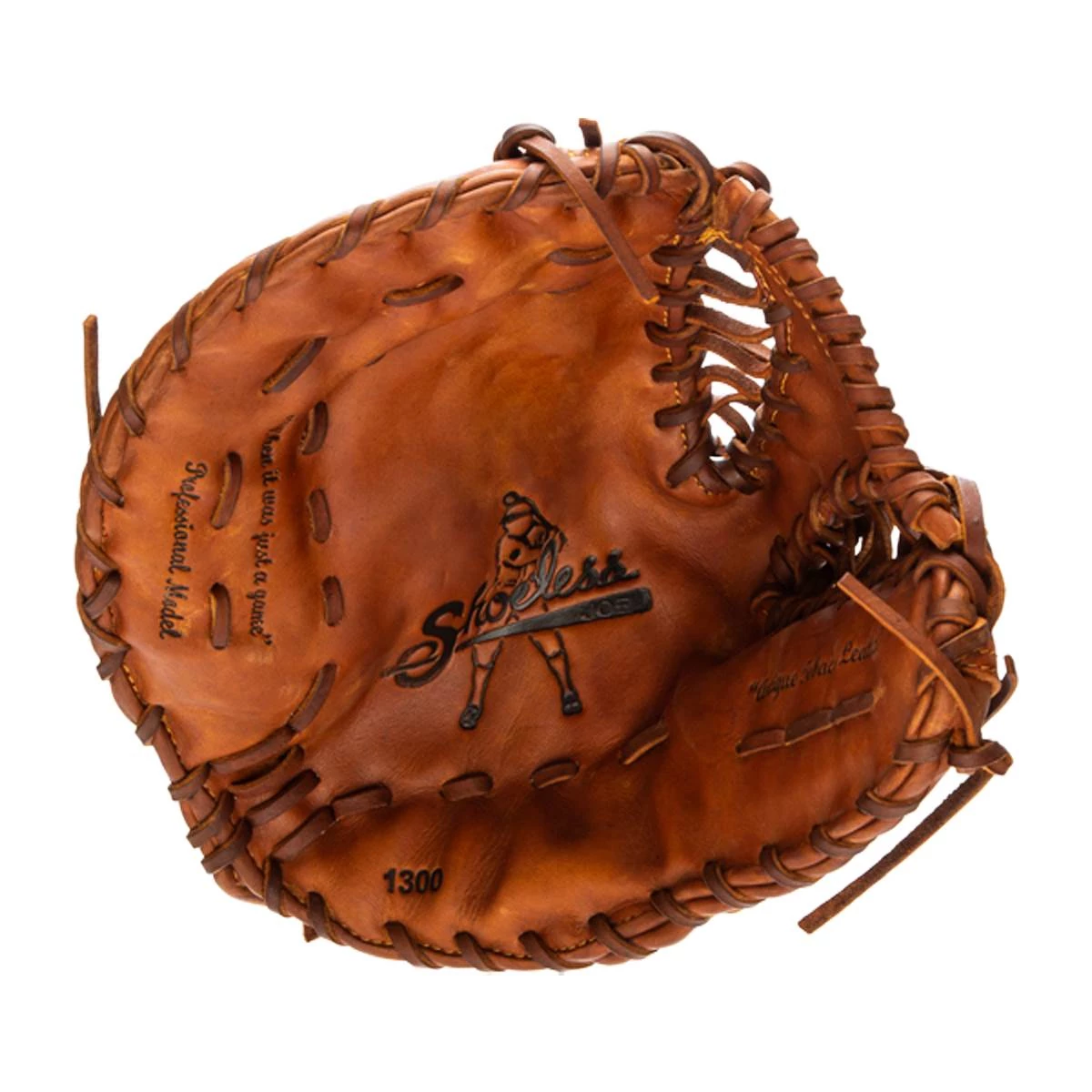 This Shoeless Joe Glove 1300FBTT First Base Mitt gives a player the quality, feel and style of the gloves used by professional ball players over the last 100 years. You can choose glove models used in the first half of century in the Golden Age Series or today`s models in the Professional Model Series. The Shoeless Joe gloves are individually hand-cut and sewn from Special Aged Antique Tobacco Leather Hides. Shoeless Joe gloves are then hand-rubbed with old time ingredients to soften the leather before they go through their breaking in process that leaves the Glove with a beaten up and `Game Worn` look and feel, of a broken in glove. Thus each glove is unstructured giving it its own unique feature. Players can choose to play with an old time or modern day web without having to change to another model. A great play is lived only once, but your glove, you`ll keep it forever. If you end a game with a clean uniform our gloves are not for you. Shoeless Joe: When it Was Just a Game! Call JustBallGloves for assistance at 866-321-4568. Free Shipping!